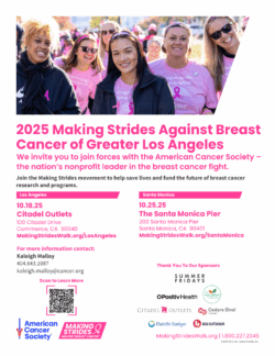 We’d love to invite you and your colleagues to participate in Making Strides Against Breast Cancer of Greater Los Angeles. This campaign is focused on women’s health – from prevention to survivorship – and will culminate in two amazing 5k breast cancer walks during the month of October: Making Strides of Los Angeles at the Citadel Outlets on Saturday 10/18 and Making Strides of Santa Monica at the Santa Monica Pier on 10/25. Both walks are giant pink parties that honor caregivers, survivors, and thrivers and are fun for the whole family. We’d be thrilled to see you t